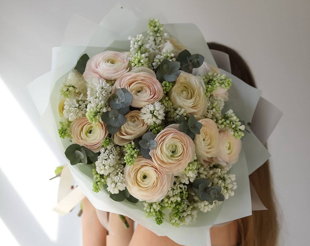 Ранункулюс, бузок, евкаліпт, калька, стрічки.