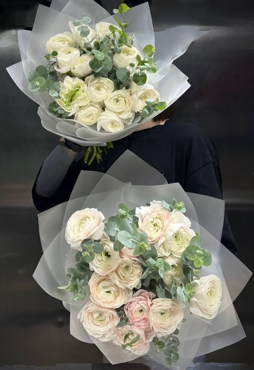 Ранункулюс, евкаліпт, калька, стрічка.