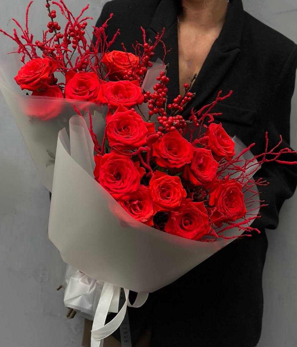 Троянда, ілекс, декоративні гілки, калька, стрічка.