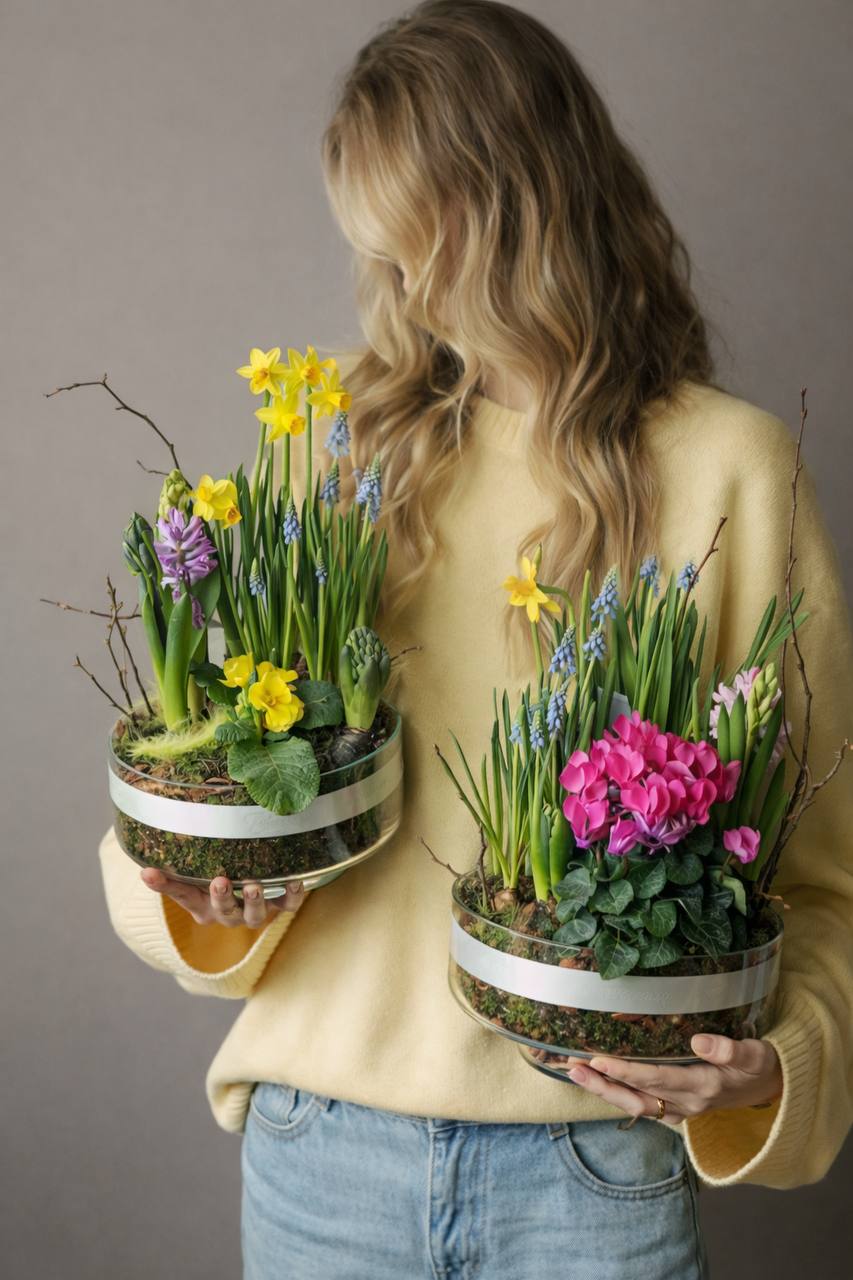 Мускарі, нарцис, гіацинт, цикламєн, кашпо, мох, декор.