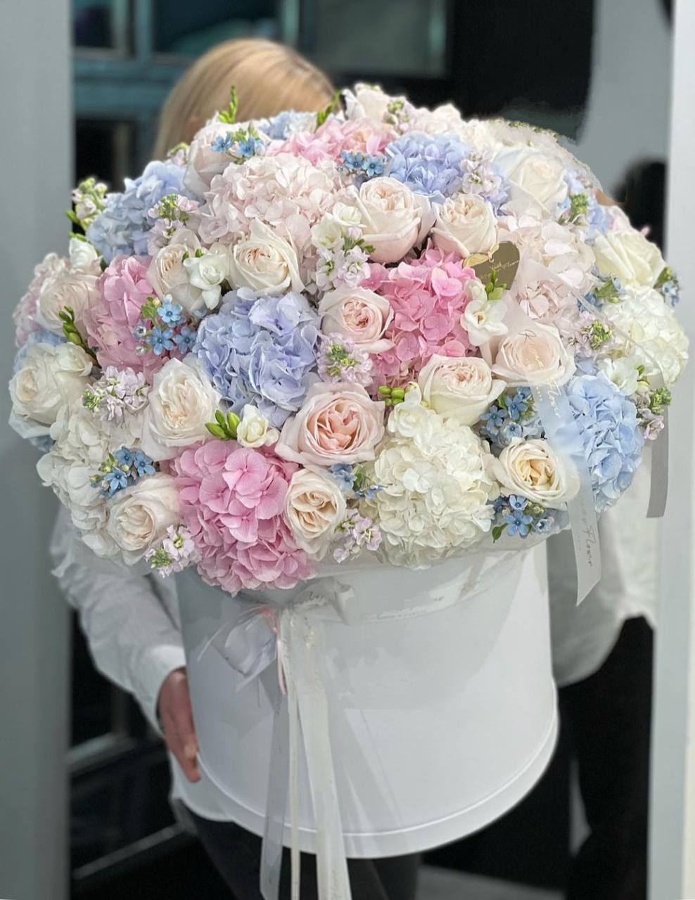 Гортензія, піоноподібна троянда, матіола, оксіпіталум, фрезія, коробка.