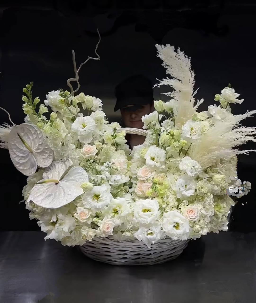 Матіола, антіріум, еустома, кущова троянда, гортензія, картадерія, антуріум, каріліус, кошик.