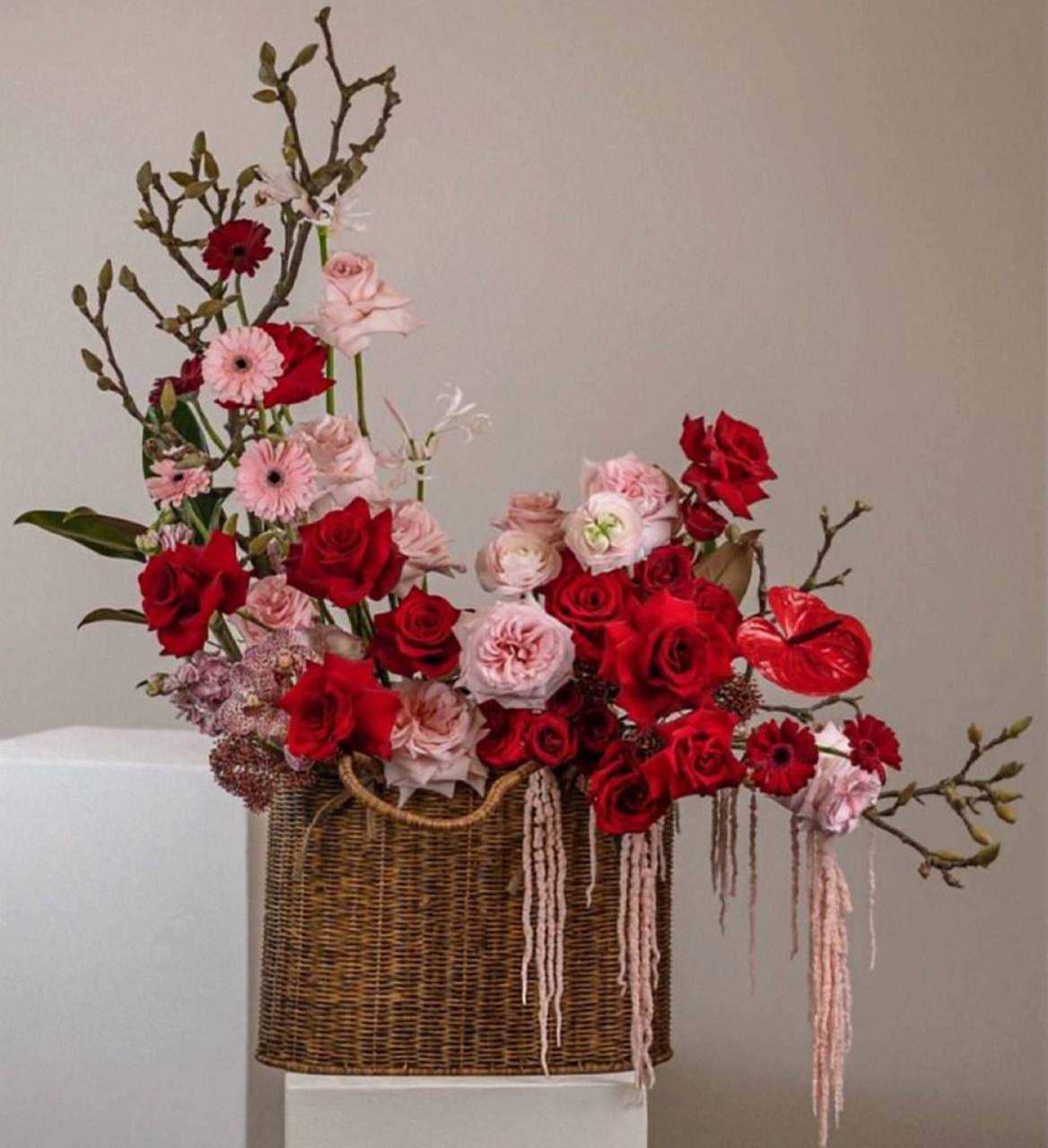 Ранункулюс, троянда, піоноподібна троянда, анігозантус, гербера, скімія, листя, антіріум, екзотіка, амарант, сумка.
