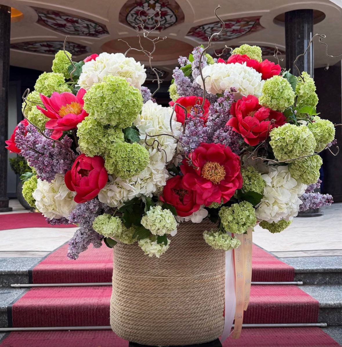 Півонія, гортензія, вібурнум, бузок, декоротивні гілки, кошик, стрічки.