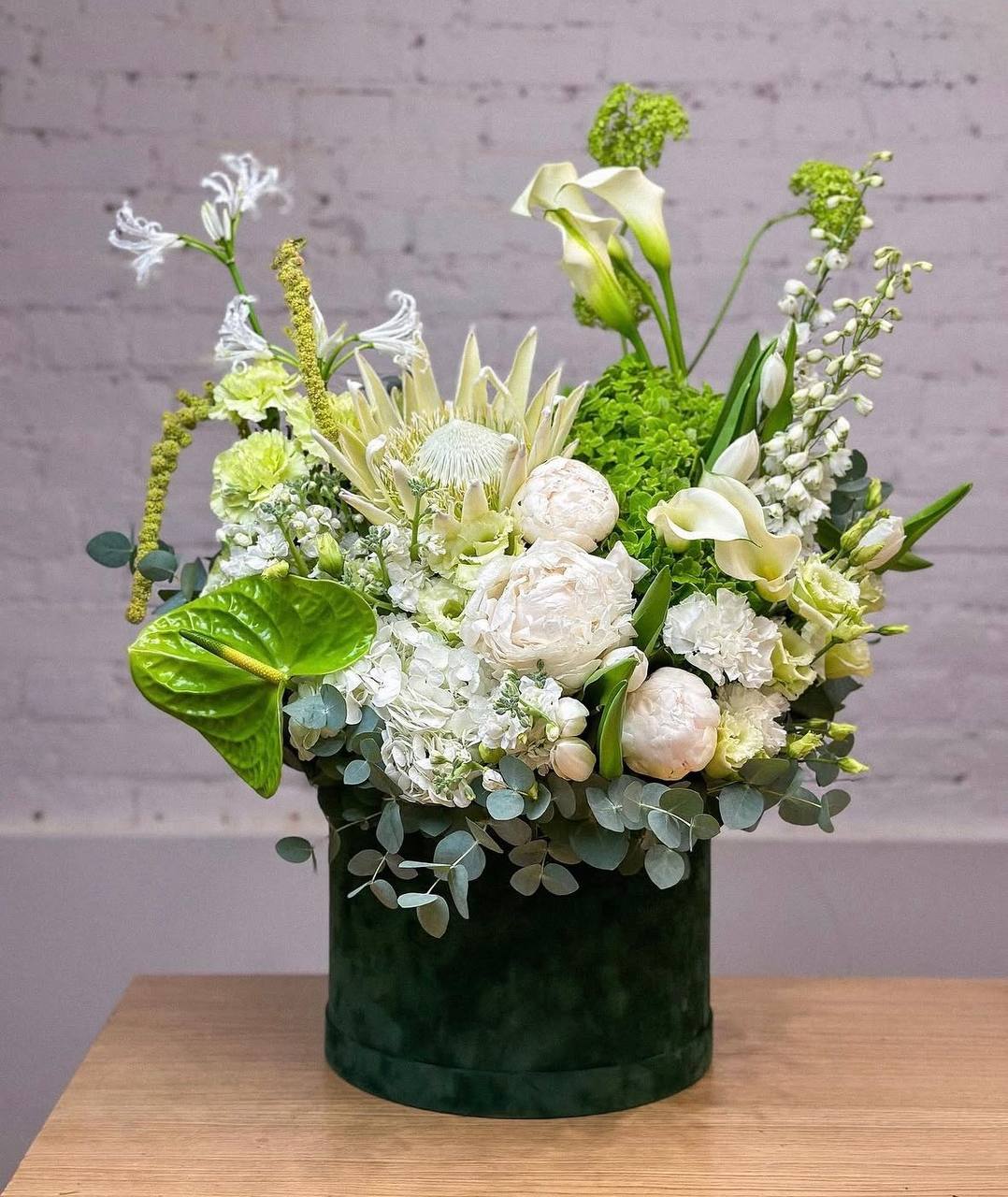 Гортензія, протея, півонія, кала, антуріум, дельфініум, тюльпан, гвоздика, еустома, вібурнум, екзотика, евкаліпт, коробка.
