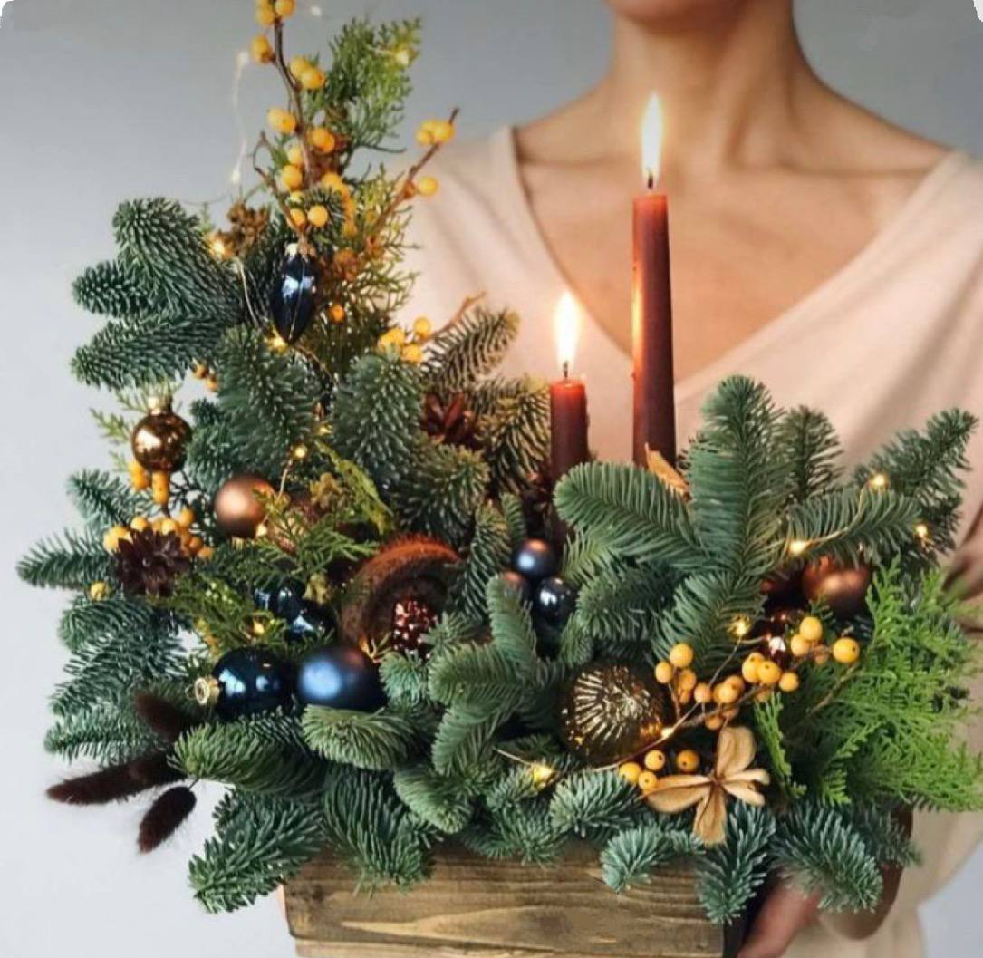 Нобіліс, зелень, ілекс, свічки, лагурус, герлянда, декор, ящик.